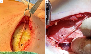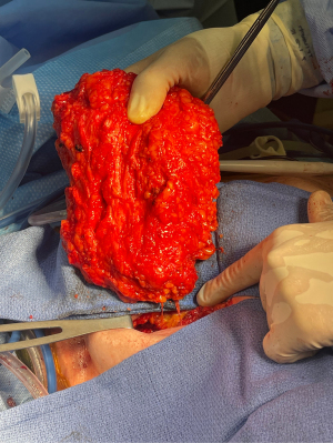 We began performing what we have termed “sensation-preserving mastectomies” primarily with immediate implant-based reconstruction but also with aesthetic flat closure and DIEP flap reconstruction in our practice in February 2018 and have now done over 800 of these procedures. The technique, which has been previously described (38), involves both intercostal nerve preservation and nerve grafting from intercostal nerves to subareolar nerves. Briefly, during mastectomy (almost exclusively NSM in our practice), care is taken during the lateral dissection to preserve the lateral, superficial branches of the 3rd, 4th, or 5th intercostal nerves whenever possible at the thoracic cage. Preservation is done when considered oncologically safe as defined by favorable anatomy with the nerves running within the subcutaneous tissue and not through the breast parenchyma itself (Figures 1,2). If identified nerves are found to be running through the breast parenchyma, they are carefully dissected out to length within the parenchyma until no longer oncologically safe, at which point the nerves are sharply transected (Figure 3).