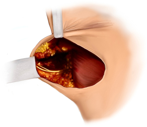 As was described earlier in anatomic studies, we have found that the lateral intercostal nerves can almost always be identified within 1 to 2 cm of the lateral border of the pectoralis major muscle. We find that the ideal time to identify these is to look for them when the breast is being taken off of the chest wall from superior-medial to inferior-lateral (Figure 4). With this approach, significant native nerve length can often be achieved, as well as identification of other non-dominant nerves that could be used for an autograft. For identification of the subareolar nerves, the nerve fibers are usually located adjacent to subareolar vessels which are typically located in a radial spoke-like configuration in this region (Figure 5). These tissues can be distinguished from the subareolar dermal tissues, which are typically localized in a concentric pattern.