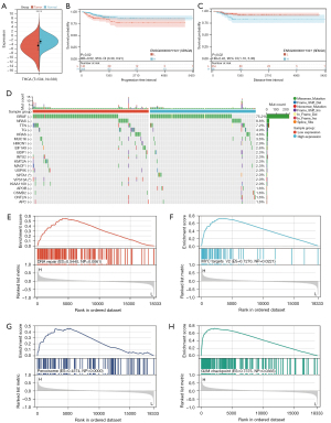 The expression of SPAG6 was lower in tumor samples compared to normal samples. The prognostic value of SPAG6 in THCA varied (Figure 8A), with high expression being associated with high PFI and low expression being associated with high DFI (Figure 8B,8C). Low SPAG6 expression indicated a lower risk of THCA and tumor recurrence but a higher risk of death from nonneoplastic causes. Mutational analysis revealed frequent BRAF (–) gene mutations in both the SPAG6 high- and low-expression groups, with distinct mutations in the SPTA1 gene for the high expression group and the VPS13A gene for the low expression group (Figure 8D). GSEA revealed distinct signaling pathways associated with high and low SPAG6 expression, including DNA repair, MYC targets, peroxisome, and G2M checkpoint, which could explain the observed clinical outcomes (Figure 8E-8H).