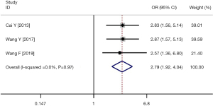 Three studies reported on incision length greater than 5 cm. Heterogeneity testing (I2=0.0%; P=0.97) indicated no significant heterogeneity, leading to the use of a fixed-effects model for analysis. The analysis results suggest that incision length greater than 5 cm is associated with an increased risk of postoperative SSI in patients undergoing thyroid surgery, with statistically significant differences [OR =2.79; 95% CI: (1.92, 4.04); P<0.001]. See Figure 5 and Table 3 for details.