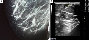 On clinical examination, a non-tender well-circumscribed mass measuring approximately 1 cm × 1 cm was palpated in the lower-inner quadrant of her right breast, associated with a mild bluish-red discoloration of the overlying skin. There was no nipple discharge whereas there were no palpable axillary or supraclavicular lymph nodes.