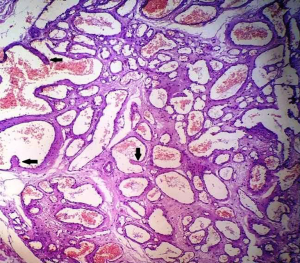 Histologically, breast hemangiomas are characterized by the presence of interconnecting dilated thin-walled vascular channels lined by flat endothelial cells, in the absence of atypia (1,3,10). Depending on the size of the vessels involved breast hemangiomas can be classified into capillary and cavernous types (1,11). Cavernous hemangiomas are the most common subtype (12).
