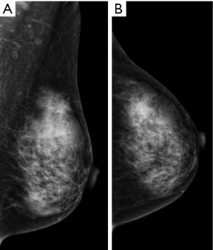 Figure 1 Radiographic examination results. (A,B) The mammography showed a high-density mass with obscured boundaries: (A) mediolateral oblique view; (B) craniocaudal view.