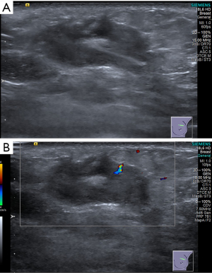 Figure 2 Two-dimensional and color Doppler ultrasound images of mass. (A) Left breast features a hypoechoic mass approximately 30 mm × 13 mm × 20 mm in size at the 12 o’clock position, with unclear borders and irregular shape. The internal echogenicity of the mass is heterogeneous, with only slight hypoechogenicity visible. (B) Color Doppler ultrasound displays a prominent thick vessel within the tumor.