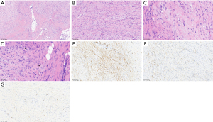 After resection, the tumor underwent postoperative pathological examination (Figure 4). The results confirmed invasive tumor growth infiltrating the adipose tissue (Figure 4A). The tumor cells were spindle-shaped with moderate atypia (Figure 4B,4C) and a low mitotic rate (fewer than 5 per 10 high-power fields) (Figure 4D). Focal areas showed myxoid changes. Immunohistochemistry results indicated SMA (partial+) (Figure 4E), desmin (focal+) (Figure 4F), beta-catenin (nuclear−), MyoD1 (−), Myogenin (−), S100 (−), MUC4 (−), H3 K27Me3 (no loss), CD34 (−), EMA (−), TLE1 (−), and Ki-67 (MIB-1) (5% positivity) (Figure 4G).
