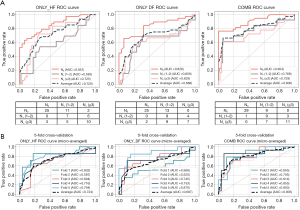 The COMB model demonstrated the highest predictive performance among all models, achieving an AUC of 0.888 (95% CI: 0.788–0.951) in the training set, 0.861 (95% CI: 0.793–0.922) in the validation set, and 0.837 (95% CI: 0.788–0.879) in the test set. The only handcrafted features (ONLY_HF) model, which was fully composed of handcrafted features, exhibited better predictive performance than did the deep feature-based model [only deep-learning features (ONLY_DF)] in both the training and test sets. It achieved AUC values of 0.792 (95% CI: 0.677–0.880) in the training set and 0.739 (95% CI: 0.683–0.789) in the test set (Table 5).