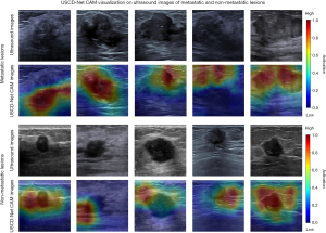 Gradient-weighted class activation mapping was adopted to visually investigate the interpretability of the deep learning radiomics model. This method generated a coarse localization map that highlighted the critical regions contribution to classification (22). For SLN status prediction, the final convolutional layer in the last residual block was visualized to enhance transparency and interpretability (Figure 5). Two imaging features have demonstrated significant diagnostic value for predicting SLN metastasis: the lesion boundary and the lobulated areas.