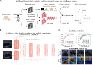 Previous studies employing radiomics, deep learning, or machine learning approaches have attested to their value in BC analysis, particularly for differentiating malignant from benign lesions (24,25). In this regard, US data have become a valuable source for radiomics analysis (26,27). Yu et al., using a cohort of 426 individuals, established a radiomics nomogram with US findings to predict ALN status in early-stage invasive BC. Their model demonstrated moderate accuracy, with AUC values of 0.78 and 0.71 for the training and validation sets, respectively (26). Our handcrafted radiomics feature-based model (ONLY_HF) achieved comparable performance, with AUCs of 0.792 and 0.739 in the training and test sets, respectively. Additionally, Yao et al. (28) further investigated the utility of US radiomics for determining SLN metastasis in early-stage invasive BC. Their study evaluated 278 patients and employed four machine learning classifiers, with support vector machine exhibiting the highest predictive performance (AUC =0.920). Their study underscored the potential of machine learning-based US radiomics, especially when combined with clinicopathological factors, as a tool for precisely applying clinical treatment strategies in BC. However, the radiomics pipeline relied heavily on manual processes, such as feature extraction and selection. Variations in these steps can impact prediction accuracy and model stability (23). Compared to the work by Yao et al. (28), our study offered a substantial advancement by integrating both deep learning-based and handcrafted features derived from multimodal imaging data. While their study was limited to handcrafted radiomic features extracted from BMUS images, our approach expanded the scope to include deep features from both BMUS and CDUS images, providing a more comprehensive and robust predictive model for SLN metastasis. Deep learning streamlined this process by automatically extracting predictive features and directly yielding class probability vectors, thereby reducing dependency on handcrafted pipelines and improving overall efficiency. The superior performance of deep learning in radiological studies has been well-documented. For instance, a comparative study showed that convolutional neural network outperformed radiomics, achieving a significantly higher AUC in classifying BC lesions as benign or malignant on magnetic resonance imaging (0.88 vs. 0.81; P<0.001) (29). Building on this evidence, we integrated deep features extracted from both conventional BMUS and CDUS to enhance predictive performance. This decision was motivated by the established correlation between tumor vascularity and lymph node metastasis. Microvessel formation within tumors, a hallmark of angiogenesis, has been shown to be strongly predictive of lymphatic spread. A Doppler sonography study has demonstrated that tumor vascularity as detected through power Doppler imaging correlated significantly with lymph node involvement (30). Notably, these findings were particularly pronounced in small tumors, emphasizing the value of vascular imaging in predicting lymph node metastasis (31). Cong et al. (30) further substantiated this by identifying ultrasonographic vascularity as an independent predictive factor for non-SLN involvement and tumor burden—findings consistent with earlier research. By leveraging on CDUS data, which captures vascular characteristics indicative of lymph node involvement, our models aimed to harness this rich source of predictive information. The inclusion of deep features from CDUS not only complemented the radiomic features derived from BMUS but also provided a more comprehensive representation of tumor biology, ultimately improving diagnostic accuracy in predicting SLN metastasis.