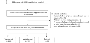 Our study included 539 women, each with one BL. After evaluation of the data, 450 women (mean age 52.28±8.36 years; age range 32–80 years) with 450 malignant BLs were selected for the final analysis (Figure 2). The participants were randomly assigned to three groups: a training set (276 patients), a validation set (105 patients), a test set (69 patients). Based on SLN or axillary lymph node (ALN) dissection results, 144 women were identified with a disease-free axilla (N0) (training: 70; validation: 36; test: 38), 124 women had a low metastatic burden of axillary disease (N1–2) (training: 111; validation: 47; test: 13), and 113 women had a high metastatic burden (N ≥3) (training: 95; validation: 22; test: 18). Patients from Shuguang Hospital Affiliated to Shanghai University of Chinese Traditional Medicine were set as an external validation set. Table 1 presents the patient characteristics, including age, US size, histologic type, ER, and PR status, Ki-67 index, and HER2 status. No significant differences were found between the characteristics of the training and test sets (all P values >0.05).