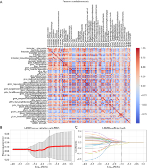 To evaluate the consistency of RoI annotations, two radiologists independently delineated the RoI regions in the images. Inter-observer agreement was assessed by calculating the ICC across the five observers, resulting in an ICC of 0.83±0.015. Additionally, intra-observer agreement was determined by having each radiologist reannotate the same RoI regions after a one-week interval, yielding an ICC of 0.85±0.025. A total of 105 handcrafted features were initially extracted from the original images. Following Pearson correlation analysis with a threshold of 0.70, the feature set was reduced to 22 handcrafted features, as illustrated in the heatmap (Figure 3A). Subsequently, LASSO regression was applied, with the optimal alpha value determined as 0.03199. This process further reduced the feature set to 6 features, comprising firstorder_Minimum, glcm_Contrast, glcm_Correlation, glcm_Imc2, glszm_SizeZoneNonUniformityNormalized, and ngtdm_Strength.