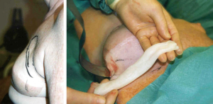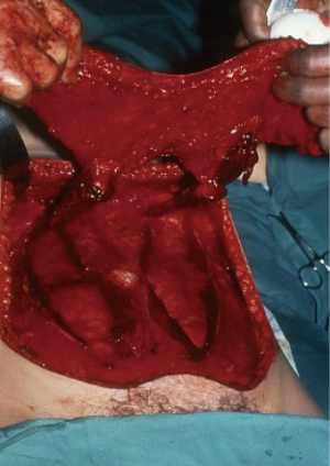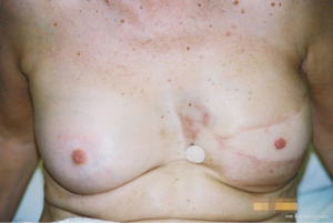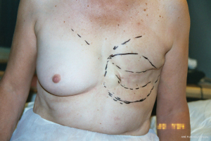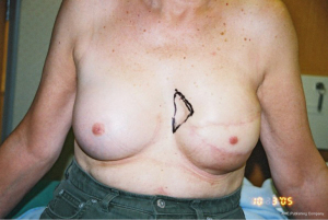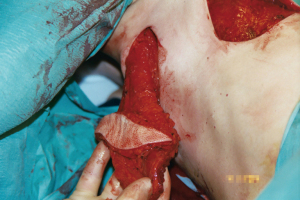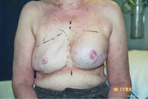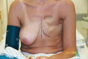 The surgical options for breast reconstruction before 1972 were limited and very much depended upon the resultant deformity created by surgical and radiological treatment of often late presenting patients with visible malignant disease of the breast. The reconstructive outcome was poor and generally would only result in a mound rather than a symmetrical breast. Sponge or padding inserts in bras were the best way to disguise the deformity, particularly when clothed. The mutilating Halsted radical mastectomy originated in the 1890’s from the misconceived idea that a higher cure rate and a lower recurrence rate from breast cancer would follow a radical excision of all adjacent anatomy (Figure 1). This was still naively practiced up until the 1970’s until a ‘voice for women’ helped change the malpractice. This procedure included removal of all the breast with skin, the ipsilateral chest wall muscles that included pectoralis major and minor, and sometimes resection of ribs and all of the axillary lymph nodes (1), and it was also often followed up with ultra-radical radiotherapy. Severe deformity, intractable pain, lack of mobility of the arm, extreme lymphoedema, radiation necrosis and severe psychological impact followed. Eventually it became clear that neither survival nor local recurrence rates were improved by such aggressive surgery (2). A modified Patey approach was then put forward as a less aggressive modified radical mastectomy option (3). This technique removes only the breast and underlying pectoralis major fascia with axillary lymph nodes and conserves the pectoralis minor muscle (Figure 2). Often, especially with larger tumours, remaining chest wall skin was purse string sutured leaving small defects that accommodated a skin graft. The preservation of pectoralis major gave a less deforming, but still significant contour chest wall defect. Radiotherapy frequently followed surgical ablation with the concept of destroying local and planktonic cells; however, pre-ablative radiotherapy was, and is still given to reduce tumour size prior to mastectomy. The adjacent irradiated tissues became a problem with poor wound healing when primary closure, grafts or local flaps were attempted, and healing could only be achieved with confidence by the introduction of well-vascularised non-irradiated tissues. Unfortunately, wound healing also became a major issue when thin skin flaps were raised during skin preserving techniques especially when the wound was closed under tension. Reconstruction for both these scenarios proved extremely unsatisfactory, but was accepted by women because there were few alternative options available.