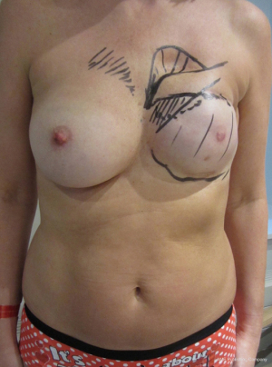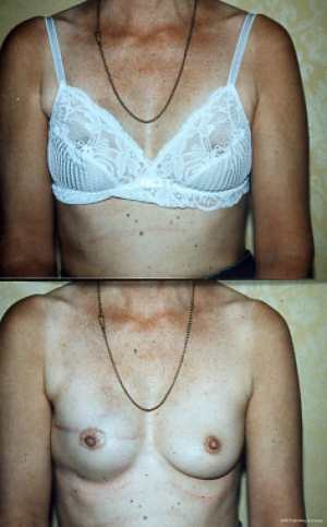 In many respects all breast reconstructions are about trying to create a mound that looks reasonable and is a mirror image to the other side, especially in a bra (Figures 18,19). It is unlikely there will be a normal looking sensate, soft, ptotic breast following ablative surgery in larger breasted women using implants alone and complications will be higher. However, for slim, small breasted women with no contralateral ptosis a small implant can give an excellent mound onto which a 2-stage nipple reconstruction using a composite chondro-cutaneous graft harvested from the ear tragus and a colour matching tattoo can give an excellent result. The colour will however change over time and further tattoo may be requested. An alternative method of forming a projecting nipple involves the use local skin flaps, but these will flatten over time especially if the closure is tight. Nipple areola tattooing is now widely used to complete a breast reconstruction.