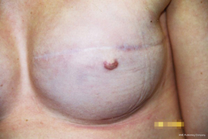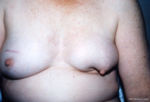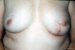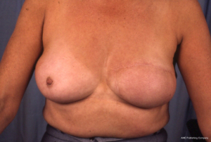 A breast reconstruction after mastectomy usually needs a minimum of three staged procedures to optimise the aesthetic result. The first two procedures intend to establish a satisfactory mound with symmetry to the remaining breast, and the third stage involves reconstruction of a nipple. The latter is best done independently once the reconstruction has settled and that allows the correct symmetrical placement of nipples. All reconstructive options are considered based upon the starting point and clinical management of the malignancy, i.e., if radiotherapy is required or if there is pre-existing musculoskeletal structural asymmetry. In general, the more aggressive the mastectomy, the older the patient, or the need for adjunctive therapy will likely complicate a reconstructive plan. For those women that have the option for a reconstruction, the first stage can be performed immediately at the time of mastectomy or delayed until the wounds have healed and decisions on oncologic care are made. The patient must be carefully counselled, and the surgeon only proceed to a reconstruction if the patient is realistic in aesthetic expectation (Figures 3-7).