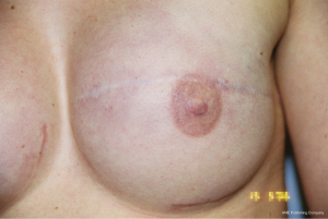 Implants are still inserted in primary mastectomy reconstructions, but also secondarily to reconstruct a breast mound when there is healthy and adequate soft tissue cover or to augment a low volume flap reconstruction of breast. Dow Corning implants were first used in the UK for some breast reconstructions in the late 1970’s and the original implants were smooth, anatomically shaped with a fabric tag designed to prevent rotation. They were nearly always used in delayed/secondary reconstruction of the breast, but the results were generally poor and ruptured implants released a liquid form of silicone that caused significant problems from granuloma formation. The tags became fixed within the tissue response causing the implants to frequently rupture due to shear forces where the remaining implant was mobile within a smooth walled fibrous capsule. Capsular contracture and its consequences were seen in all patients (Figure 17), and to try and counter this, implants were placed into a sub-pectoralis major plane, that sometimes included a sub-serratus anterior plane, to get better soft tissue cover (11). The intention was always to get the best cosmesis possible and residual asymmetries were corrected using external adjuncts and nipple prostheses and nipple reconstructions (Figures 18-22).