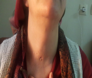 One of our patients is a 48 years old female, admitted with a neck swelling (Figure 1). Her thyroid function tests are normal. She had a right partial and left near total thyroidectomy six years ago. In the neck ultrasonography, there was a 25 mm × 26 mm, heterogeneous nodule with a hypoechoic rim on the superior of the right thyroid lobe. In the scintigraphy, that nodule was normoactive while another nodule in the lower pole was hyperactive. Fine needle aspiration biopsy showed that both nodules consists of benign follicular epithelial cells.