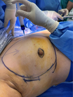 Marking gel (mixture of blue dye with sterile gel) is injected along the anatomical borders of the breast to delineate the dissection field. Hydrodissection is also performed with the use of tumescent solution, a physiological saline mixed with adrenaline and lignocaine, allowing clearer identification of the planes for subsequent flap creation (Figure 2).