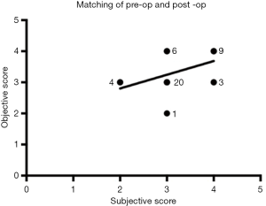 To assess similarity, Spearman rank order tests found that the objective and subjective ratings for the pre-operative photos were significantly similar (P=0.003, rs =0.57). It also found the two ratings for the post-operative photos to be significantly similar (P=0.02, rs =0.45). When grouping together all photos, assessments of pairing effectiveness found that subjective and objective scoring were significantly similar (P=0.0004, correlation coefficient r=0.50) (Figure 4).