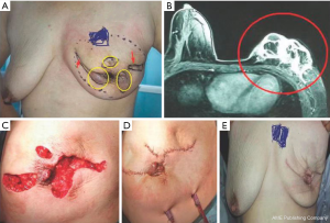 All patients underwent two main different treatments respectively depending on the range of breast lesion and lesion within abscess or not. (I) For patients with abscesses in mammary lesion: we took a three-step treatment: firstly, patients had pus drainages by usage of Mammotome or an open surgery, while negative-pressure drainage tube may be placed and biopsy for pathological diagnosis could also be done simultaneously. Secondly, patients took the conservative therapy, including medication therapy and regional wet compress on the lesion. The main drugs of the medication therapy included: the Xihuang capsules-a Chinese traditional medicine (trade name, Xihuangjiaonang; 1.2 g, 2 times a day) and intravenous antibiotics (Levofloxacin Hydrochloride and Sodium Chloride injection, 0.3 g 2 times a day for 1 week). Some patients may add glucocorticoids (methylprednisolone tablets, 8 mg, 2 times a day for 2 weeks; then 4 mg, 2 times a day for 1 week; and then reduce dosage by half till 4 mg once a day) if she had erythema on lower extremities and was suspicious of having autoimmune disorders. Regional wet compress used 50% magnesium sulfate, 20 minutes each time, totally over 6 hours a day. Thirdly, when size of the lesion had a significant shrink (≤1 quadrant) and the skin swelling became detumescent, the patients could choose an open surgery for lesion excision and breast reconstruction (LE + BR). The essentials of the surgery included: to remove all the breast lesion involving necrotic adipose tissue and mammary glands, the range of which displayed by MRI; to excise lactiferous ducts posterior of nipple which had relationship to the lesion; to reconstruction the breast by transposition with the residual glands, the surrounding tissues such as adipose and fascia tissues from armpit or lateral chest wall or the areas under the folds of the breast, trying to maintain good shape of the breast. Similarly, breast reconstruction may integrate plastic surgery techniques with intraglandular flap, fascia flap or epidermis removal following the excision of skin ulcerations and necrosis. (II) For patients without abscesses in breast lesion: if the range of lesion was larger than two quadrants of ipsilateral breast, the patients would underwent the Xihuang capsules/antibiotics/regional wet compress regimen before lesion excision; if the original lesion was smaller than one quadrant, LE+BR can be done immediately after the short-time medication therapy. Intraglandular flap was enough for cosmic result only. For a small number of patients who refused to the surgery of lesion excision, she would continue the conservative therapy including Xihuang capsules/regional wet compress +/− pus drainage+/− glucocorticoid.