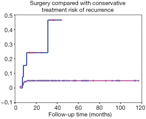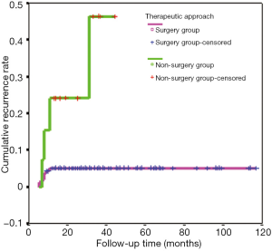 In 178 cases, follow-up visits by consultations lasted for 13 to 117 months, with median of 29 months. In surgery group, eight patients of 164 had relapse of GLM, the cure rate was 95.1% (156/164). In non-surgery group, 14 patients underwent the conservative therapy from 6 to 14 months before clinical cure was obtained, with an median of 8.6 months, and four patients of which got lesion recurred, the cure rate 71.4% (10/14). The clinical cure rate of surgery group was significantly higher than that of non-surgery group, with a significant difference of χ2=11.517, P=0.001. The difference between the two groups was statistically significant by further Spearman’s correlation analysis, r=−0.254, P=0.001 (Table 3). The Kaplan-Meier survival curve of the two types of treatment showed that the relapse of GLM was rarely occurred in the patients undergoing surgical therapy more than 1 year, log rank =11.84, P=0.0006 (Figure 9). The observation of the recurrence cases was not continue in our study.