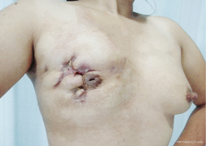 If GLM is not combined with breast cancer, it is indeed not life-threatening. But in China, there have been a large number of GLM patients in recent years. Yet there are no institutions for epidemiological investigations. This research center is the largest provincial general hospital in Hunan Province. Before 2009, there were fewer than 10 GLM patients treated each year. The number of GLM patients admitted and treated in the past 5 years has risen rapidly. The number of patients per year has exceeded 200, showing a rapid upward trend. This phenomenon also occurs in other large general hospitals and various provinces in China. The research center is working with a number of large general hospitals in Hunan Province to investigate possible causes. In the past, in China, GLM is a rare and rare disease. It is not only basic hospitals, but also breast surgery in large hospitals. It is not known clearly about these diseases, and it is often treated as simple mastitis. If there is an abscess in the breast, the pus will be cut open. After an incision of pus, combined with antibiotics and topical dressings, the lesion may be relieved. But after a few weeks or months, an abscess is seen in another location. If the doctor takes another incision and drains the pus, it will last for several months. In a few years, the patient’s breasts are scarred (see Figure 10), and even the last case of total breast resection due to necrosis of the entire breast is also present (Figure 11). It can be seen that if this disease is not controlled in time, not only is the breast damaged, but also creates physical and mental health and economic burdens on the patient.