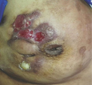 All of 178 patients had breast mass with unclear boundaries, ranging from 2~14 cm in diameter. Of them, 134 patients (75.3%) complained of skin ulcerations and swelling (Figure 1), 127 (71.3%) with abscesses (Figure 2), 18 (10.1%) with peau d’orange sign, which was easily confused with breast cancer (Figure 3), 6 (3.4%) with skin erythema on legs.