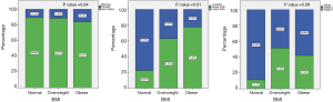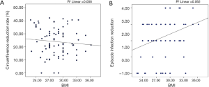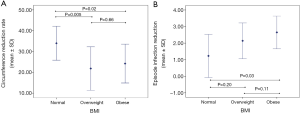 Mean circumference reduction rates were statistically different among BMI groups (F[2, 80]=5.68, P=0.005) (Table 2). The mean circumference reduction rate of normal-weight patients was significantly higher than those of overweight (P=0.005) and obese patients (P=0.02) (Figure 2A). Overweight and obese patients had similar rates (P=0.66) (Figure 2).