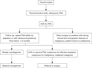 - Brandler TC, Aziz MS, Coutsouvelis C, et al. Young investigator challenge: Atypia of undetermined significance in thyroid FNA: Standardized terminology without standardized management-a closer look at repeat FNA and quality measures: AUS: Repeat FNA and Quality Monitoring. Cancer Cytopathol 2016;124:37-43. [Crossref] [PubMed]