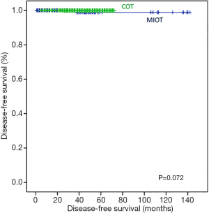 There were no mortalities during follow-up. Therefore, only DFS was compared between the two groups. In Kaplan-Meier analysis, there was no statistically significant difference in the DFS between the COT and MIT groups (log-rank P=0.072; Figure 6).