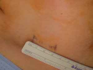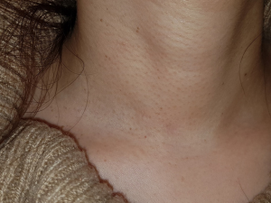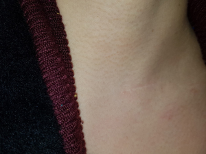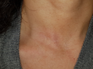 A 43-year-old woman presented with an incidentally found thyroid tumor during her annual health screening in 2017. The tumor was diagnosed as thyroid cancer by fine needle aspiration biopsy. The patient underwent MIT. The picture in Figure 7 demonstrates her wound 10 months after surgery. A 36-year-old female patient was diagnosed with thyroid cancer and underwent MIT. The picture in Figure 8 shows the wound 17 months after surgery. The next patient was a 40-year-old woman who underwent MIT after diagnosis of thyroid cancer. It is a wound after 5 years of operation (Figure 9).