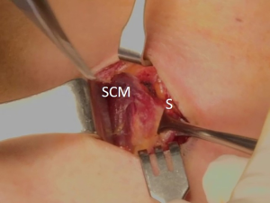 The patient was placed in the supine position on the operating table, with neck extension after general anesthesia. A 2–3-cm skin incision was made along the skin crease in the lesion side of the lower neck (Figure 1). The length of the skin incision was adjusted according to the tumor size, the size of the thyroid gland, and the presence or absence of thyroiditis. After dividing the Platysma muscle with electrocautery, skin flaps were made approximately 1 cm above and below the skin incision. The medial border of the sternocleidomastoid muscle (SCM) and the lateral border of the strap muscle were exposed using electrocautery (Figure 2). After this dissection, the omohyoid muscle could be identified, and care must be taken as the jugular vein passes under the omohyoid muscle. Along the lateral border of the strap muscles, the outside portion of the thyroid gland could be identified (Figure 3). After exposing the thyroid gland, the isthmus was completely resected over the trachea. The thyroid gland was retracted medially and inferiorly to expose its upper pole and to ligate the superior thyroidal artery and vein individually using an energetic surgical instrument. When the upper pole of thyroid gland was dissected, the whole thyroid gland could be pulled out of the skin incision (Figure 4). After confirming and preserving the inferior parathyroid gland, the recurrent laryngeal nerve was preserved, and central compartment node dissection (CCND) is performed in the same way as COT (Figure 5). Finally, Berry’s ligament was carefully divided as the specimen was obtained. The platysma and subcutaneous fatty tissues were reapproximated with interrupted 4-0 Vicryl sutures and the skin is closed using 5-0 Maxon subcuticular continuous sutures.