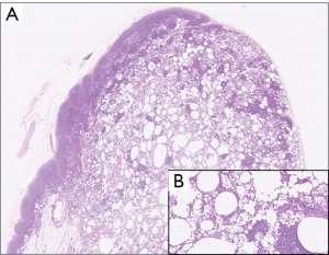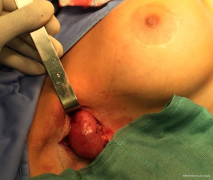 Three years after surgery, the patient complained about pain in the right axilla associated with the clinical finding of swelling. For this reason, she underwent ultrasound assessment and magnetic resonance imaging of the breasts. One lymph node of the right axilla was swollen (6 cm diameter) and presented an altered structure. We opted for surgical removal of the node and the patient was scheduled for surgery 20 days after. The axilla was surgically explored (Figure 1), the node was found and sent for histological examination (Figures 2,3). No complications occurred in the left axilla. The postoperative course was uneventful. The histological examination of the node reported a high concentration of hyaluronic acid, altering the structure of the lymph node.