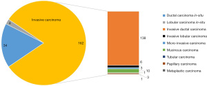 The mean age of 198 patients who undergone Mammotome biopsy and surgery was 42.9±9.5 (range, 24–73). Breast cancer with stage 0, I, II, and III accounted for 19.5%, 55.5%, 20.5% and 4.5% of all, respectively. Carcinoma in situ was observed in 19% of lesions, and the details of histology were shown in Figure 1. A percentage of 79.5% of tumors were ER positive, and 15.5% were HER2 positive. There were 10% of tumors classified into the TNBC subtype. One hundred and thirty-one patients with 133 lesions received mastectomy and 67 patients received BCS. The details of all surgical options were shown in Figure 2. To achieve the patients’ requirements for shape, 12 patients received skin-spared mastectomy combined with implantation in mastectomy group and 5 patients received BCS combined dorsal muscle flap construction in BCS group. One patient only received lumpectomy due to the pathological diagnosis of pleomorphic LCIS according to AJCC 8th. Clinic-pathological characteristics and therapies total/based on surgery options were showed in Table 1. The mean age of patients in BCS group was younger than that in mastectomy group (39.2 vs. 44.8, P<0.001). More patients received radiotherapy in BCS group than that mastectomy group (83.6% vs. 12.8%, P<0.001). There was no difference in TNM stage, histological type, ER, PR, HER2, molecular subtypes and therapies except for radiotherapy between these two groups (Table 1).