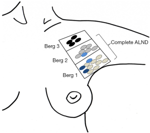 The surgery was performed under general anaesthesia. Detection of SLN was realized by the injection of 2 mL of 2.5% diluted patent blue dye under the dermis directly above the tumor and also in the parenchyma of the breast at the 4 quadrants of the peritumoral area. In the case of non-palpable tumors, the radiologist indicated the site of tumor and the injection was realized with the same process. Directly after the patent blue injection, a manual massage was then performed during 1 minute. Lymph nodes with bright and saturated blue coloration and located at level 1 of Berg were then removed and called “principal sentinel lymph nodes” (PSN) while the other nodes with detection of pale blue color located deeper in level 1 or higher at level 2 of Berg were also biopsied and called “accessory sentinel lymph nodes” (ASN, Figure 1). An ALND was then realized. Thereafter breast conservative surgery or mastectomy was realized.