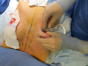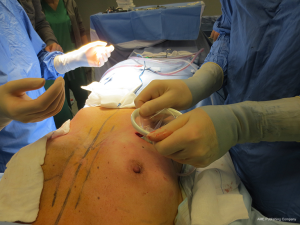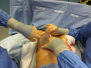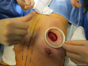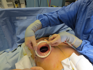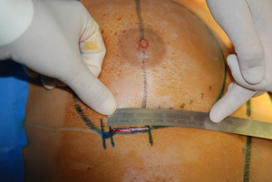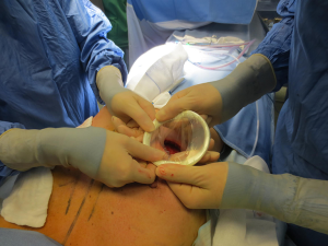 The surgical procedure is the same as described in group 1. The incision size is planned as in group 1 and extended as needed, in order to assess in which group the scar was lengthened more (Figure 1). After fashioning the pocket, the Alexis® (Applied Medical Resources Corporation) device is inserted (Figures 2-6) and the dissection is extended according to the implant size. Hemostasis is also obtained. Suction drains are positioned, one per site. The pocket is then irrigated as above and the implant is introduced leaving the Alexis® (Applied Medical Resources Corporation) inserted (Figures 7-9). If needed, the incision can be lengthened. Finally, the Alexis device is removed (Figure 10) and the incision is closed in the usual manner in two layers. Drains management is as above. One of two surgeons performed all procedures and assessments (Luca Andrea Dessy or Marco Mazzocchi).
